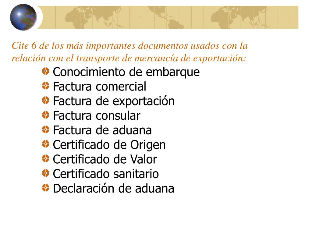 Cite 6 de los más importantes documentos usados con la relación con el transporte de mercancía de exportación: • Conocimiento de embarque • Factura comercial • Factura de exportación • Factura consular • Factura de aduana • Certificado de Origen • Certificado de Valor • Certificado sanitario • Declaración de aduana