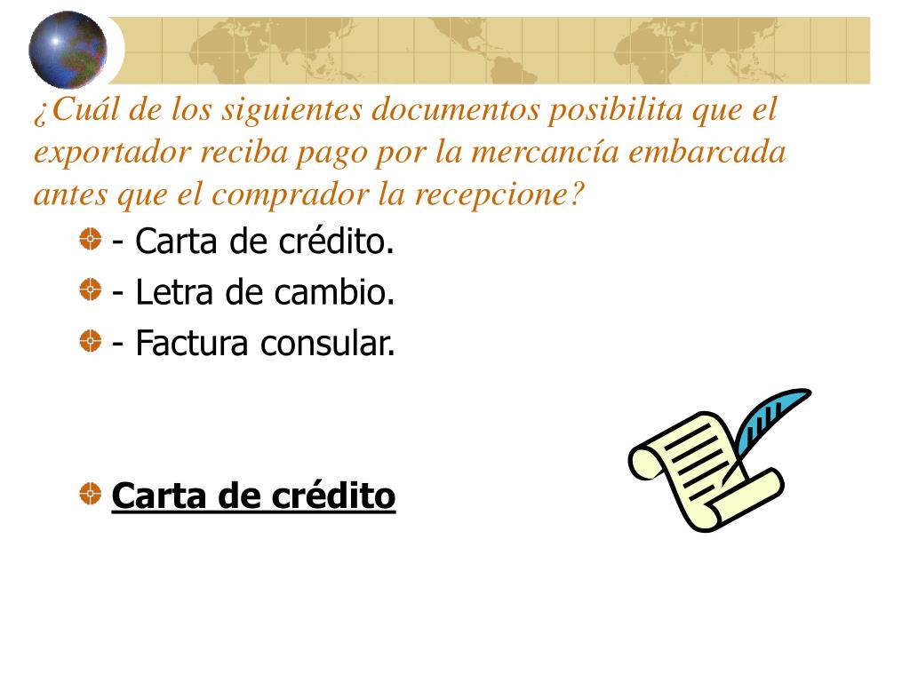 ¿Cuál de los siguientes documentos posibilita que el exportador reciba pago por la mercancía embarcada antes que el comprador la recepcione? • - Carta de crédito. • - Letra de cambio. • - Factura consular. • Carta de crédito