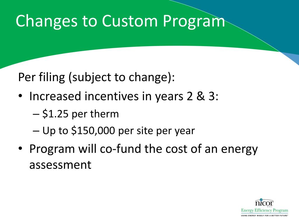 Changes to Custom Program Per filing (subject to change): • Increased incentives in years 2 & 3: • $1.25 per therm • Up to $150,000 per site per year • Program will co-fund the cost of an energy assessment