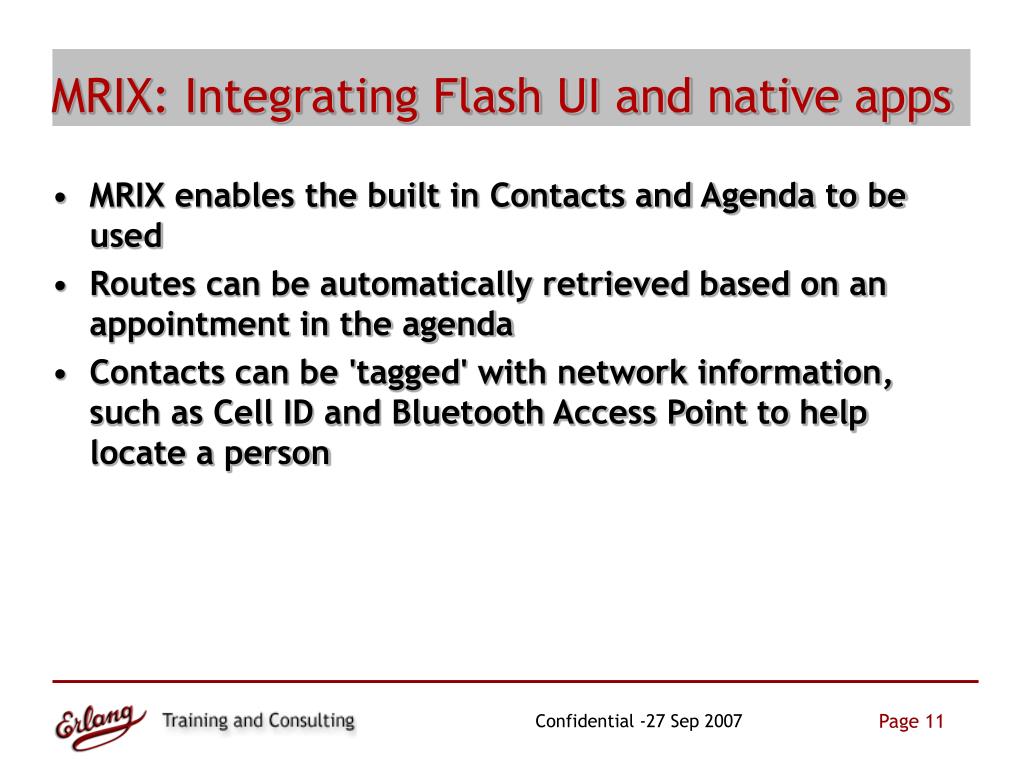 MRIX: Integrating Flash UI and native apps • MRIX enables the built in Contacts and Agenda to be used • Routes can be automatically retrieved based on an appointment in the agenda • Contacts can be 'tagged' with network information, such as Cell ID and Bluetooth Access Point to help locate a person