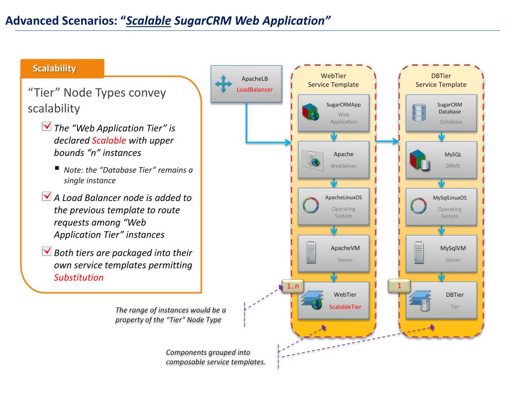 Composing a TOSCA Service Template for a “SugarCRM” Application using Vnomic’s Service Designer, www.vnomic.com • The SugarCRM application include 2 “Tiers”: • Web Application Tier (Linux, Apache, PHP, SugarCRM) • Database Tier (Linux, MySQL)