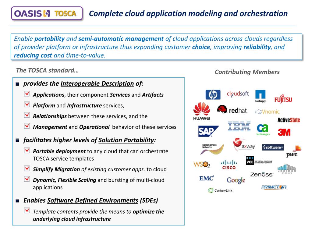 Topology and Orchestration Specification for Cloud Applications (TOSCA) Standard. TOSCA Interoperability Demonstration. Participating Companies:. Join the TOSCA Technical Committee www.oasis-open.org , join@oasis-open.org . Complete cloud application modeling and orchestration. TOSCA.