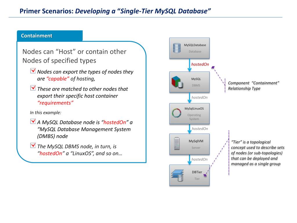 Primer Scenarios: Developing a “Single-Tier MySQL Database” Containment MySQLDatabase Database • Nodes can “Host” or contain other Nodes of specified types • Nodes can export the types of nodes they are “capable” of hosting, • These are matched to other nodes that export their specific host container “requirements” • In this example: • A MySQL Database node is “hostedOn” a “MySQL Database Management System (DMBS) node • The MySQL DBMS node, in turn, is “hostedOn” a “LinuxOS”, and so on… hostedOn MySQL DBMS Component “Containment” Relationship Type hostedOn MySqlLinuxOS Operating System hostedOn “Tier” is a topological concept used to describe sets of nodes (or sub-topologies) that can be deployed and managed as a single group MySqlVM Server hostedOn DBTier Tier