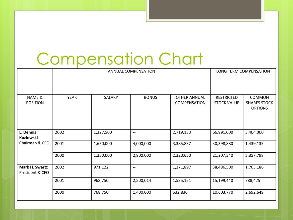 Before the Scandal • Very safe company to invest in • 2001: 240,000 employees worldwide • 2001: $38 billion in revenues • Stock, January 2001: $246.40 (all-time high) • CEO Dennis Kozlowski • CFO Mark Swartz