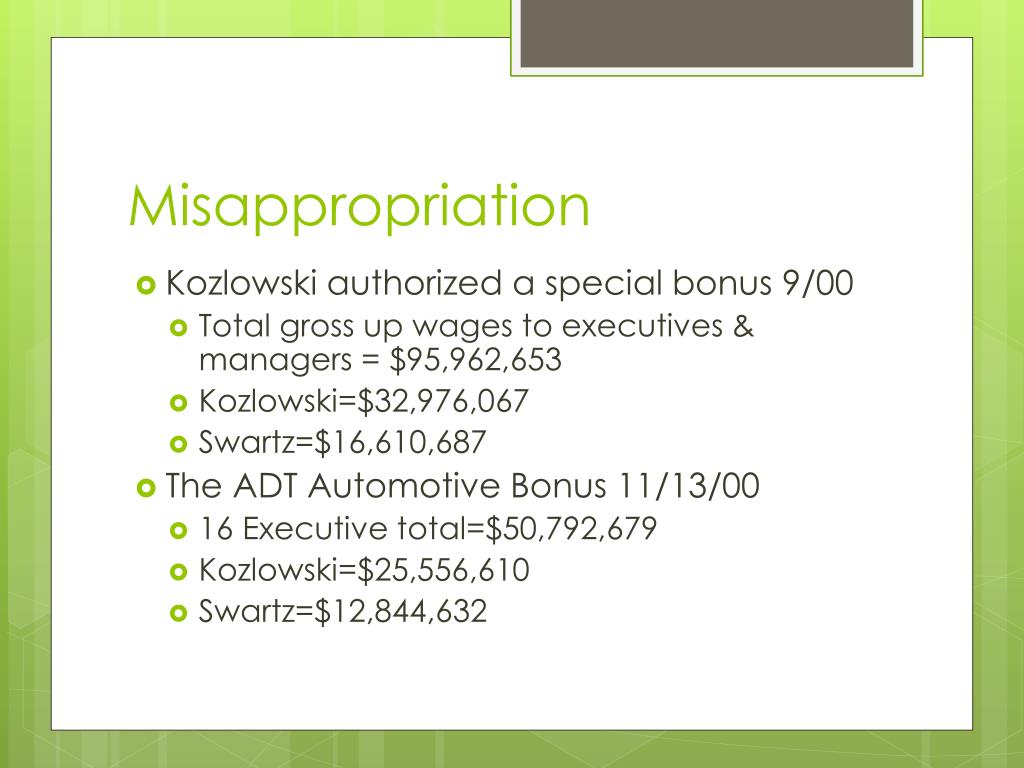 Misappropriation • Kozlowski authorized a special bonus 9/00 • Total gross up wages to executives & managers = $95,962,653 • Kozlowski=$32,976,067 • Swartz=$16,610,687 • The ADT Automotive Bonus 11/13/00 • 16 Executive total=$50,792,679 • Kozlowski=$25,556,610 • Swartz=$12,844,632