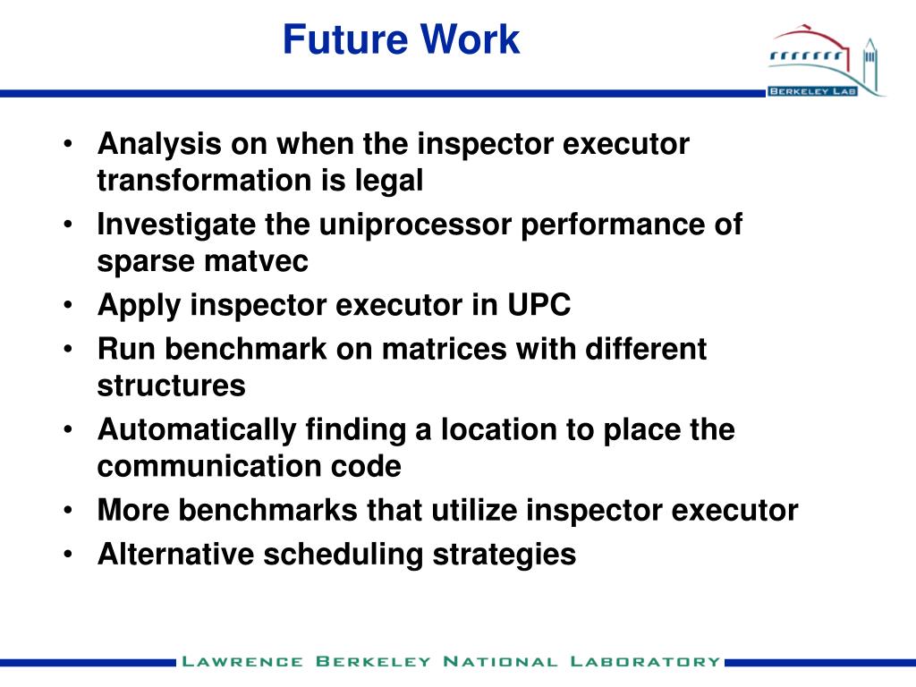 Future Work • Analysis on when the inspector executor transformation is legal • Investigate the uniprocessor performance of sparse matvec • Apply inspector executor in UPC • Run benchmark on matrices with different structures • Automatically finding a location to place the communication code • More benchmarks that utilize inspector executor • Alternative scheduling strategies