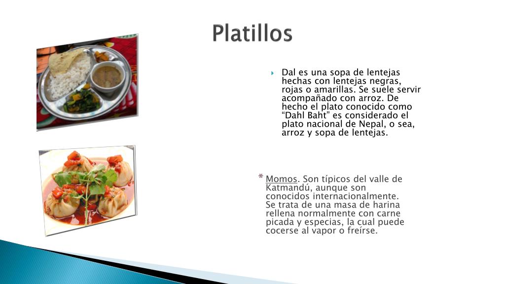 Platillos • Dal es una sopa de lentejas hechas con lentejas negras, rojas o amarillas. Se suele servir acompañado con arroz. De hecho el plato conocido como “Dahl Baht” es considerado el plato nacional de Nepal, o sea, arroz y sopa de lentejas. • Momos. Son típicos del valle de Katmandú, aunque son conocidos internacionalmente. Se trata de una masa de harina rellena normalmente con carne picada y especias, la cual puede cocerse al vapor o freírse.