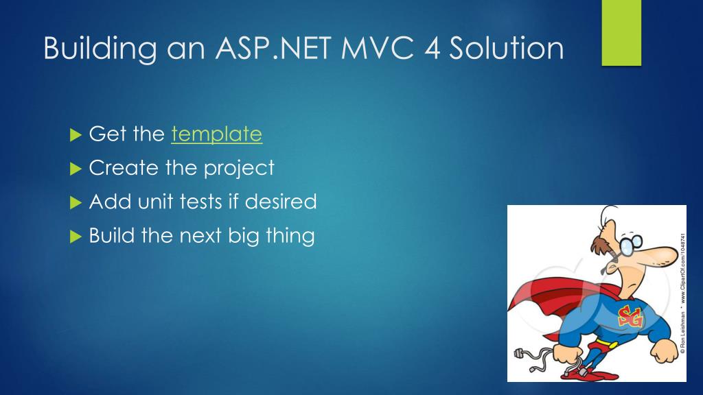 Building an ASP.NET MVC 4 Solution • Get the template • Create the project • Add unit tests if desired • Build the next big thing