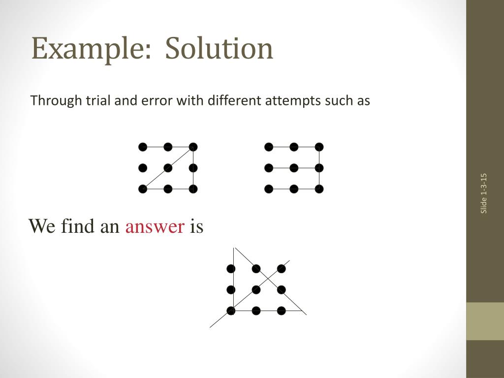 Example: Drawing a Sketch An array of nine dots is arranged in a 3 x 3 square as shown below. Join the dots with exactly four straight lines segments. You are not allowed to pick up your pencil from the paper and may not trace over a segment that has already been drawn.