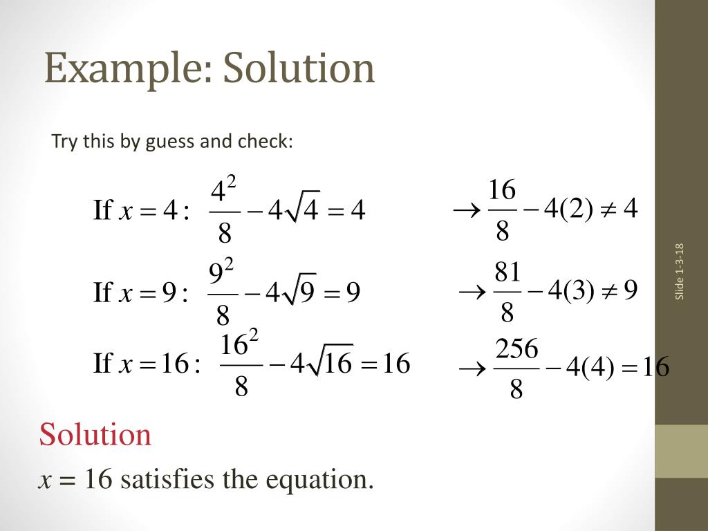 Example: Solution Try this by guess and check: Solution x = 16 satisfies the equation.