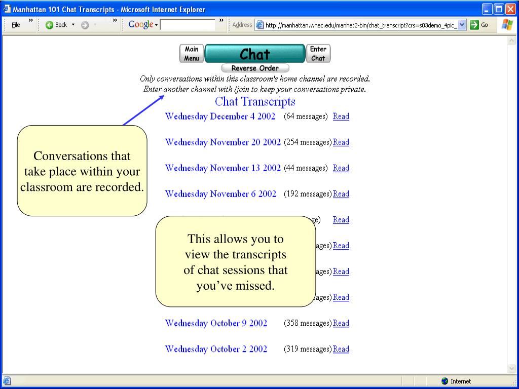 Conversations that take place within your classroom are recorded. This allows you to view the transcripts of chat sessions that you’ve missed.
