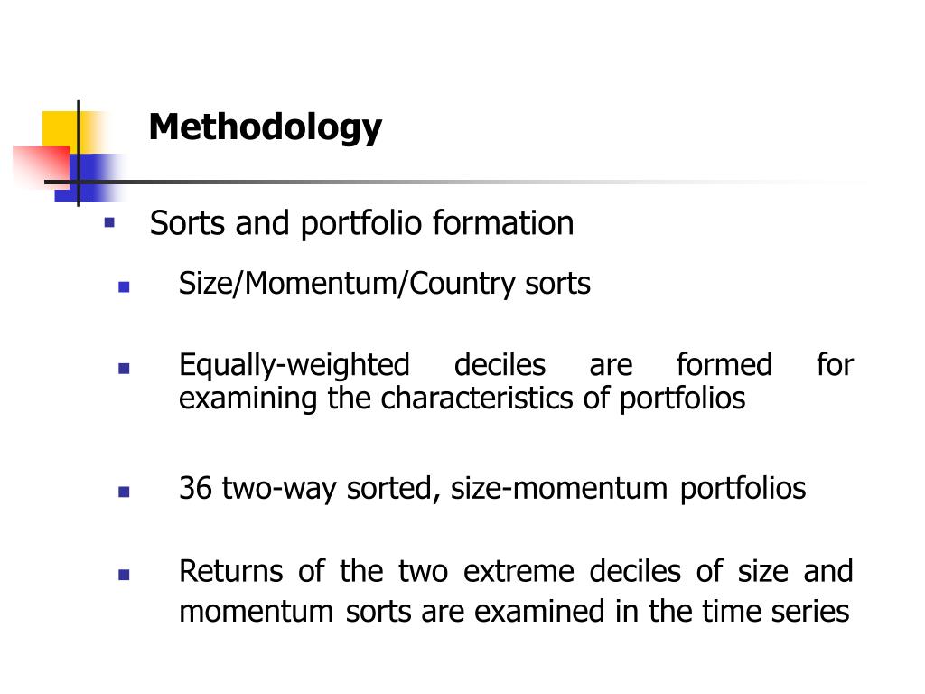 Methodology • Sorts and portfolio formation • Size/Momentum/Country sorts • Equally-weighted deciles are formed for examining the characteristics of portfolios • 36 two-way sorted, size-momentumportfolios • Returns of the two extreme deciles of size and momentumsorts are examined in the time series