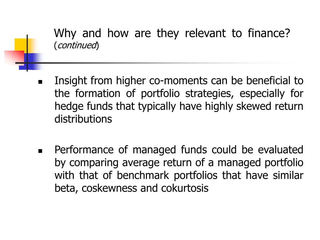 Why and how are they relevant to finance? (continued) • Insight from higher co-moments can be beneficial to the formation of portfolio strategies, especially for hedge funds that typically have highly skewed return distributions • Performance of managed funds could be evaluated by comparing average return of a managed portfolio with that of benchmark portfolios that have similar beta, coskewness and cokurtosis