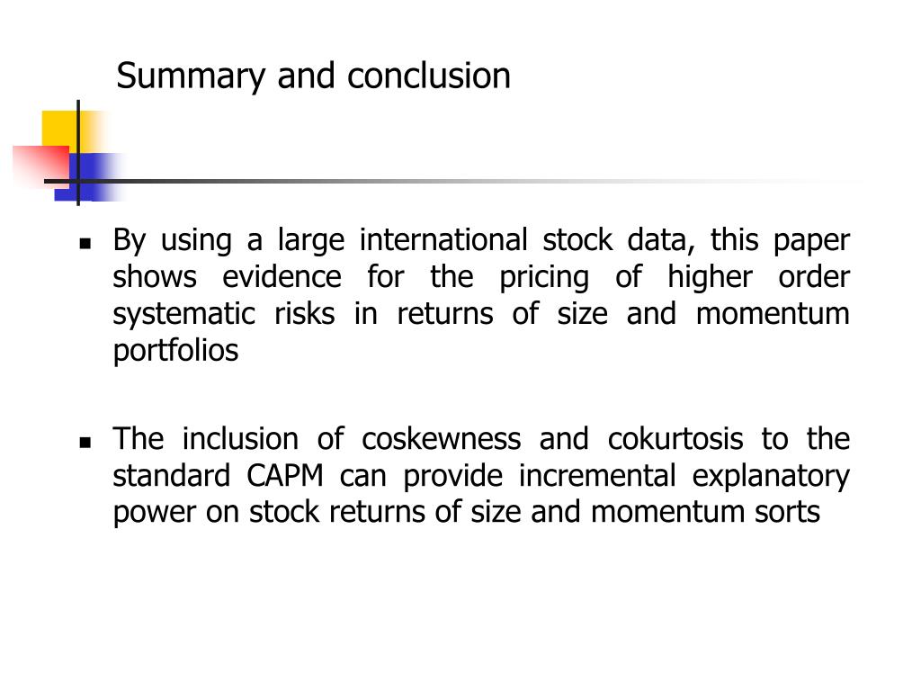 Summary and conclusion • By using a large international stock data, this paper shows evidence for the pricing of higher order systematic risks in returns of size and momentum portfolios • The inclusion of coskewness and cokurtosis to the standard CAPM can provide incremental explanatory power on stock returns of size and momentum sorts