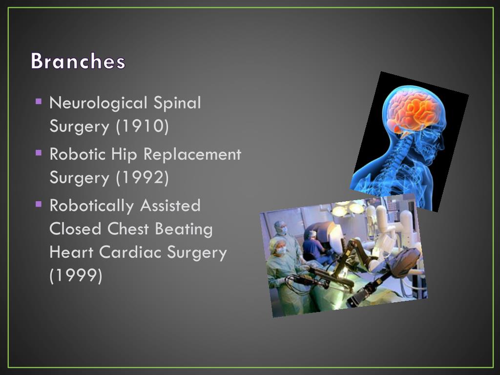Branches • Neurological Spinal Surgery (1910) • Robotic Hip Replacement Surgery (1992) • Robotically Assisted Closed Chest Beating Heart Cardiac Surgery (1999)
