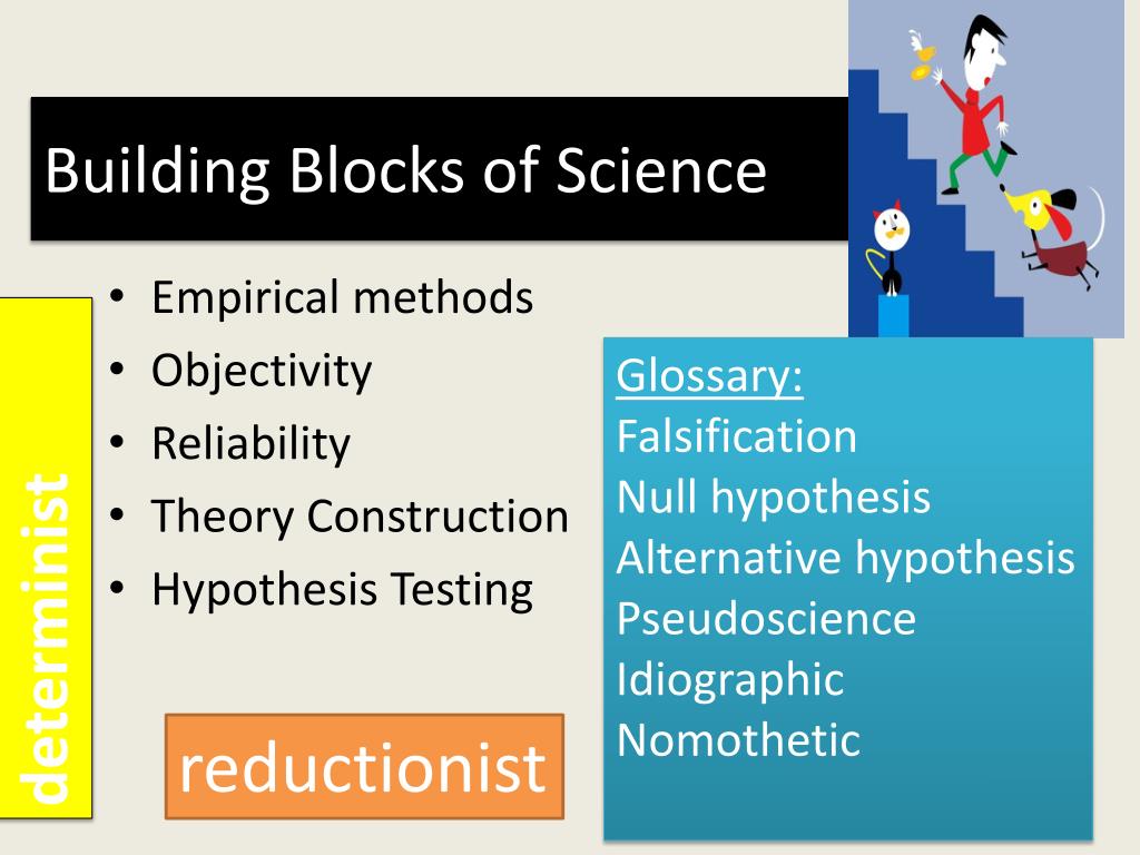 Building Blocks of Science • Empirical methods • Objectivity • Reliability • Theory Construction • Hypothesis Testing Glossary: Falsification Null hypothesis Alternative hypothesis Pseudoscience Idiographic Nomothetic determinist reductionist