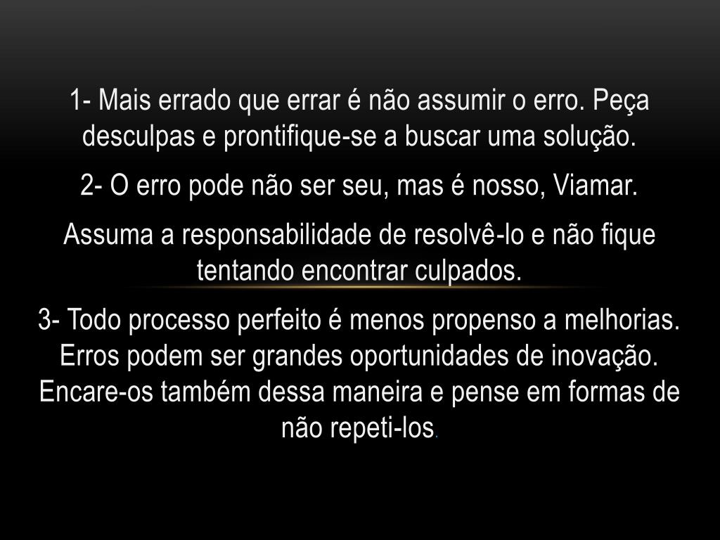 1- Mais errado que errar é não assumir o erro. Peça desculpas e prontifique-se a buscar uma solução. 2- O erro pode não ser seu, mas é nosso, Viamar. Assuma a responsabilidade de resolvê-lo e não fique tentando encontrar culpados. 3- Todo processo perfeito é menos propenso a melhorias. Erros podem ser grandes oportunidades de inovação. Encare-os também dessa maneira e pense em formas de não repeti-los.