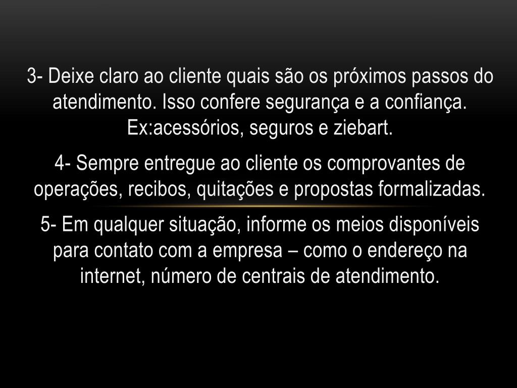 3- Deixe claro ao cliente quais são os próximos passos do atendimento. Isso confere segurança e a confiança. Ex:acessórios, seguros e ziebart. 4- Sempre entregue ao cliente os comprovantes de operações, recibos, quitações e propostas formalizadas. 5- Em qualquer situação, informe os meios disponíveis para contato com a empresa – como o endereço na internet, número de centrais de atendimento.