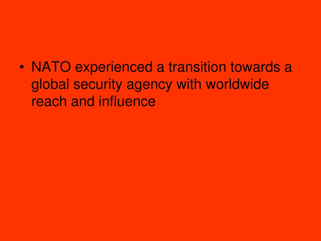 NATO experienced a transition towards a global security agency with worldwide reach and influence