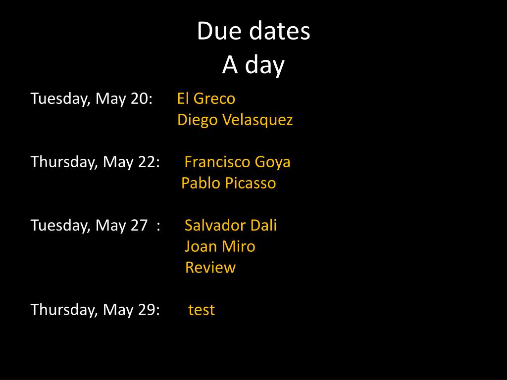 Due datesA day Tuesday, May 20: El Greco Diego Velasquez Thursday, May 22: Francisco Goya Pablo Picasso Tuesday, May 27 : Salvador Dali Joan Miro Review Thursday, May 29: test