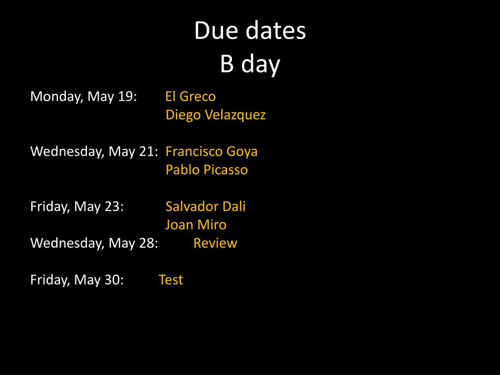Due datesB day Monday, May 19: El Greco Diego Velazquez Wednesday, May 21: Francisco Goya Pablo Picasso Friday, May 23: Salvador Dali Joan Miro Wednesday, May 28: Review Friday, May 30: Test