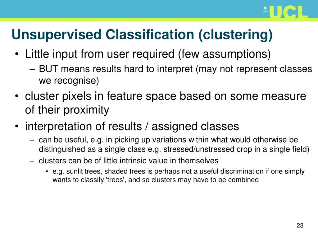 Unsupervised Classification (clustering) • Little input from user required (few assumptions) • BUT means results hard to interpret (may not represent classes we recognise) • cluster pixels in feature space based on some measure of their proximity • interpretation of results / assigned classes • can be useful, e.g. in picking up variations within what would otherwise be distinguished as a single class e.g. stressed/unstressed crop in a single field) • clusters can be of little intrinsic value in themselves • e.g. sunlit trees, shaded trees is perhaps not a useful discrimination if one simply wants to classify 'trees', and so clusters may have to be combined