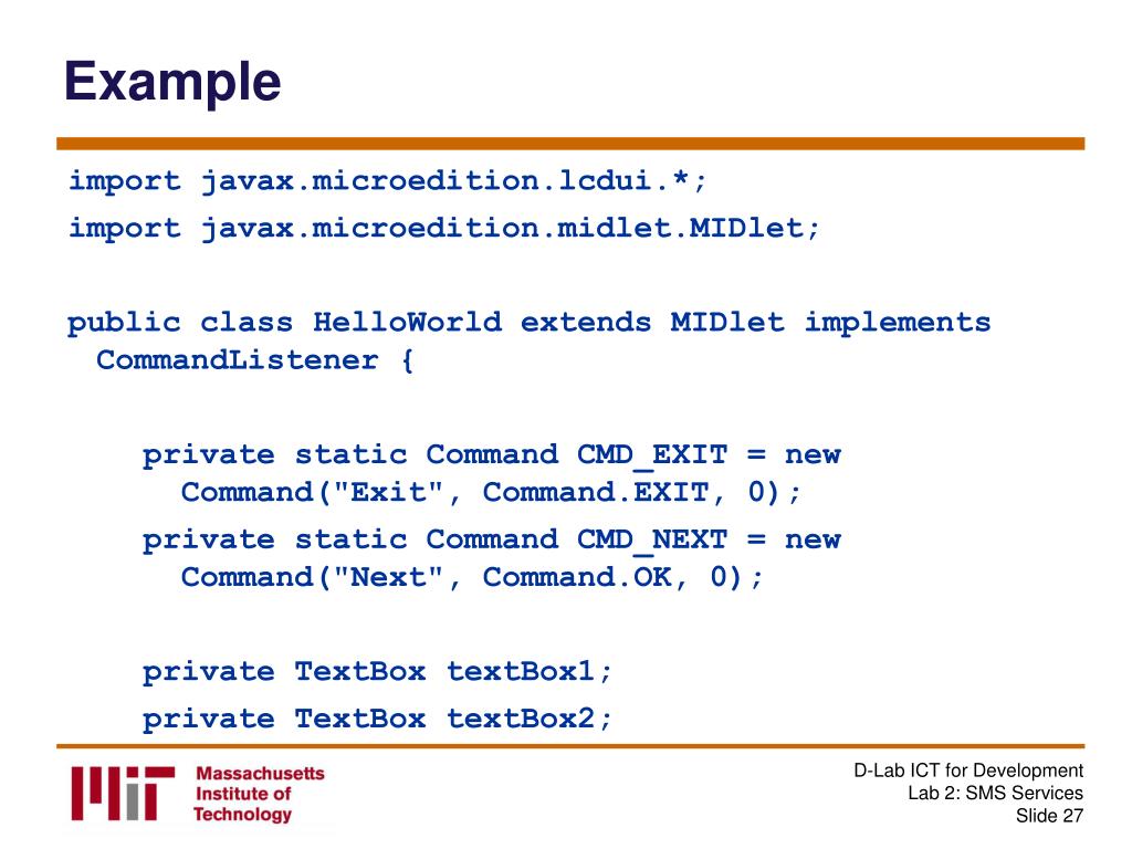 Example import javax.microedition.lcdui.*; import javax.microedition.midlet.MIDlet; public class HelloWorld extends MIDlet implements CommandListener { private static Command CMD_EXIT = new Command("Exit", Command.EXIT, 0); private static Command CMD_NEXT = new Command("Next", Command.OK, 0); private TextBox textBox1; private TextBox textBox2;