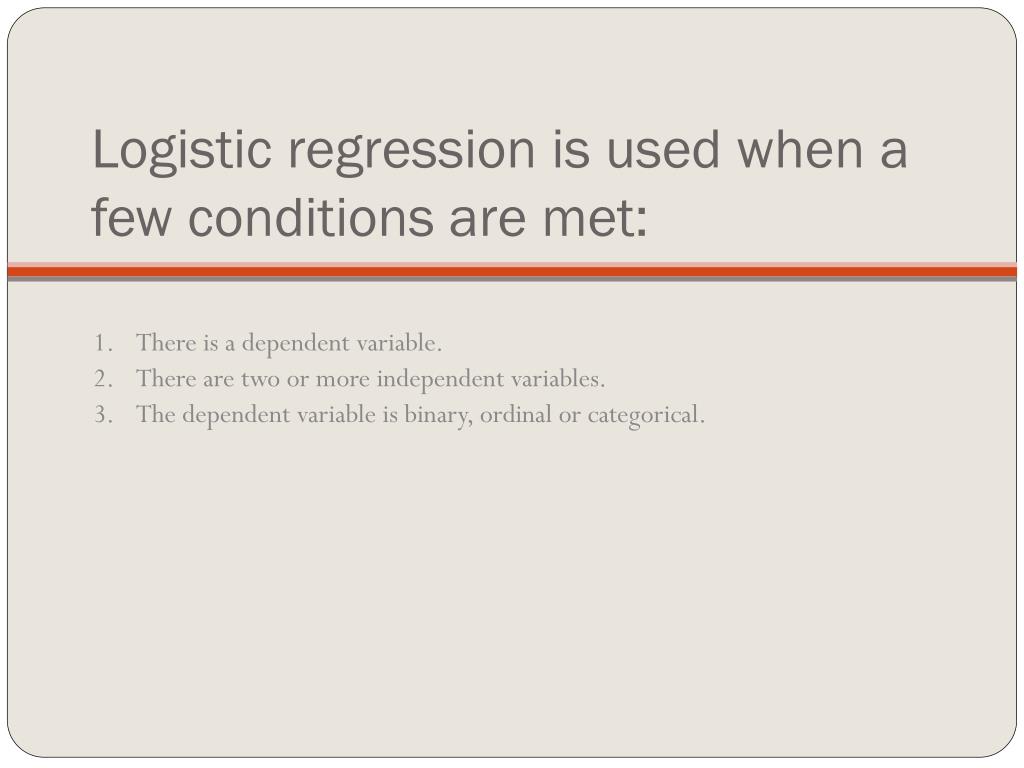 Logistic regression is used when a few conditions are met: 1. There is a dependent variable. 2. There are two or more independent variables. 3. The dependent variable is binary, ordinal or categorical.