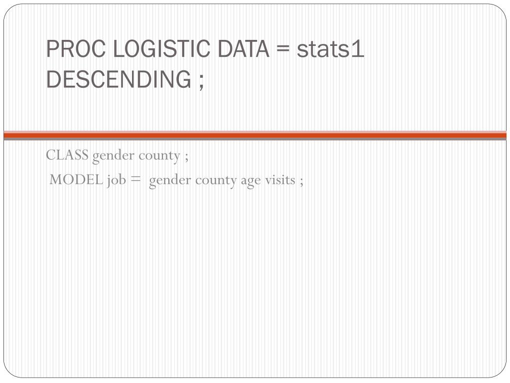 PROC LOGISTIC DATA = stats1 DESCENDING ; CLASS gender county ; MODEL job = gender county age visits ;