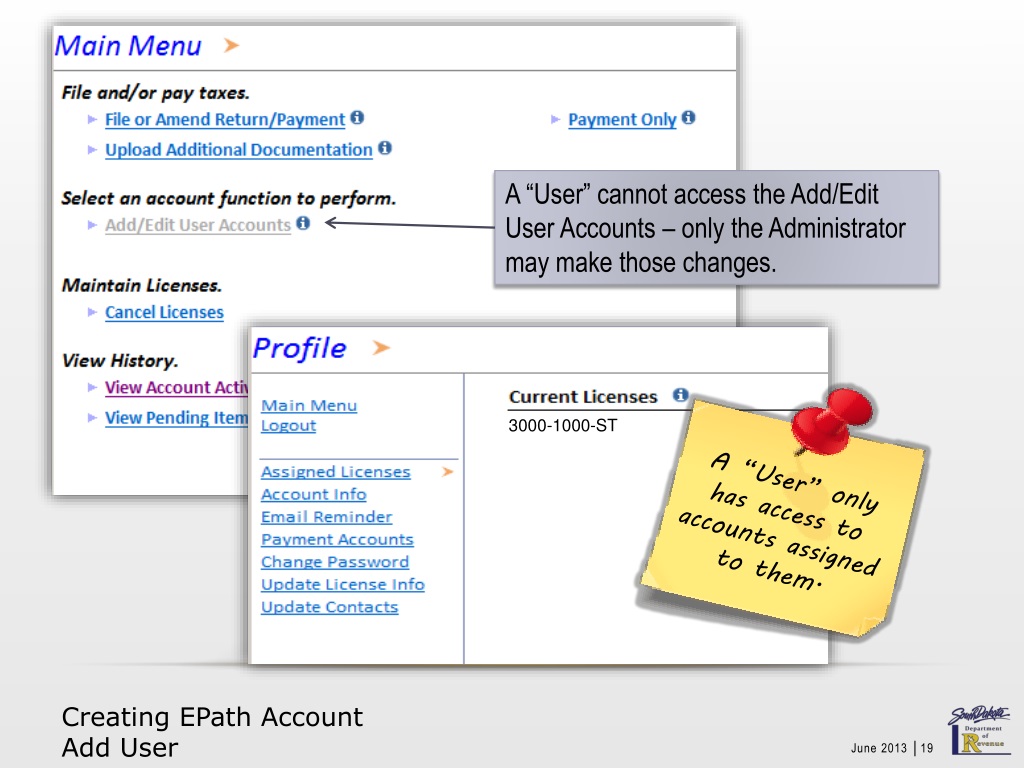 Only the “Administrator” may add licenses to an EPath account. Only licenses with the same OWNER / EIN may be added to your EPath account. If you cannot add a license with the same owner, please call for help. • To Add a license to your account: • Select “Change Profile” on the Main Menu • Select “Add License” • Enter the requested information. • Click Add • If you have not reported tax for this business, • call 1-800-829-9188 to have the license added to your EPath Account. 3000-1000-ST 3000-2222-ST The administrator can see all licenses under the EPath account. Creating EPath Account Multiple Licenses