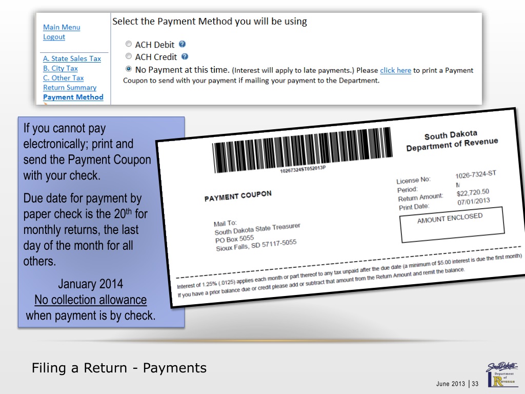 If you cannot pay electronically; print and send the Payment Coupon with your check. Due date for payment by paper check is the 20th for monthly returns, the last day of the month for all others. January 2014 No collection allowance when payment is by check. Filing a Return - Payments