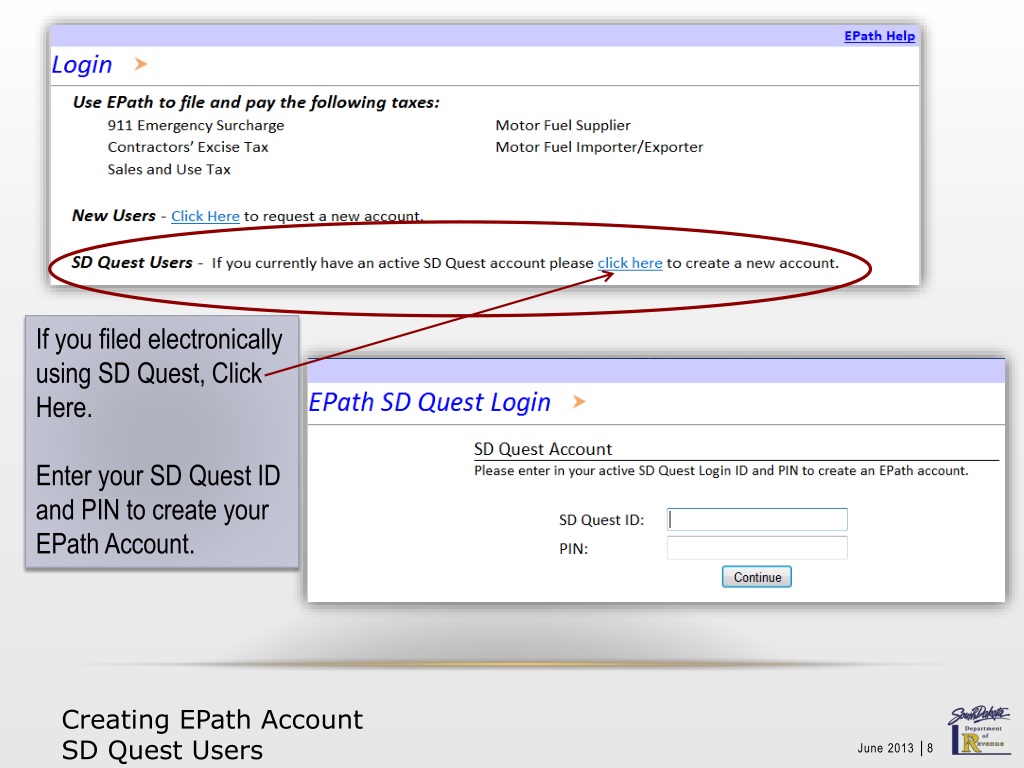 If you filed electronically using SD Quest, Click Here. Enter your SD Quest ID and PIN to create your EPath Account. Creating EPath Account SD Quest Users