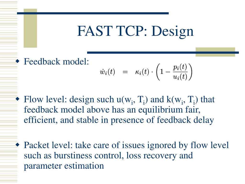 FAST TCP: Design • Feedback model: • Flow level: design such u(wi, Ti) and k(wi, Ti) that feedback model above has an equilibrium fair, efficient, and stable in presence of feedback delay • Packet level: take care of issues ignored by flow level such as burstiness control, loss recovery and parameter estimation