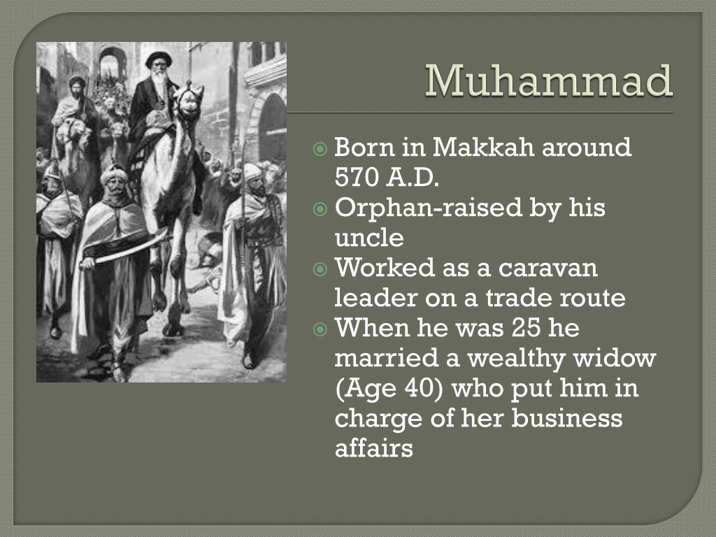 Muhammad • Born in Makkah around 570 A.D. • Orphan-raised by his uncle • Worked as a caravan leader on a trade route • When he was 25 he married a wealthy widow (Age 40) who put him in charge of her business affairs