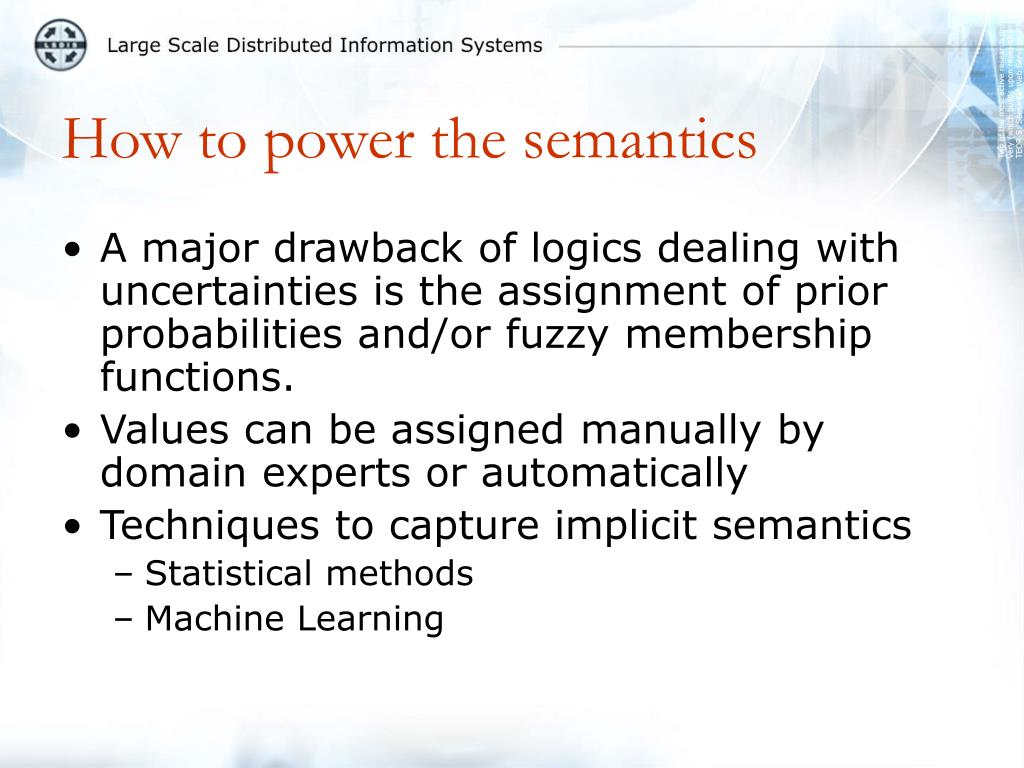How to power the semantics • A major drawback of logics dealing with uncertainties is the assignment of prior probabilities and/or fuzzy membership functions. • Values can be assigned manually by domain experts or automatically • Techniques to capture implicit semantics • Statistical methods • Machine Learning