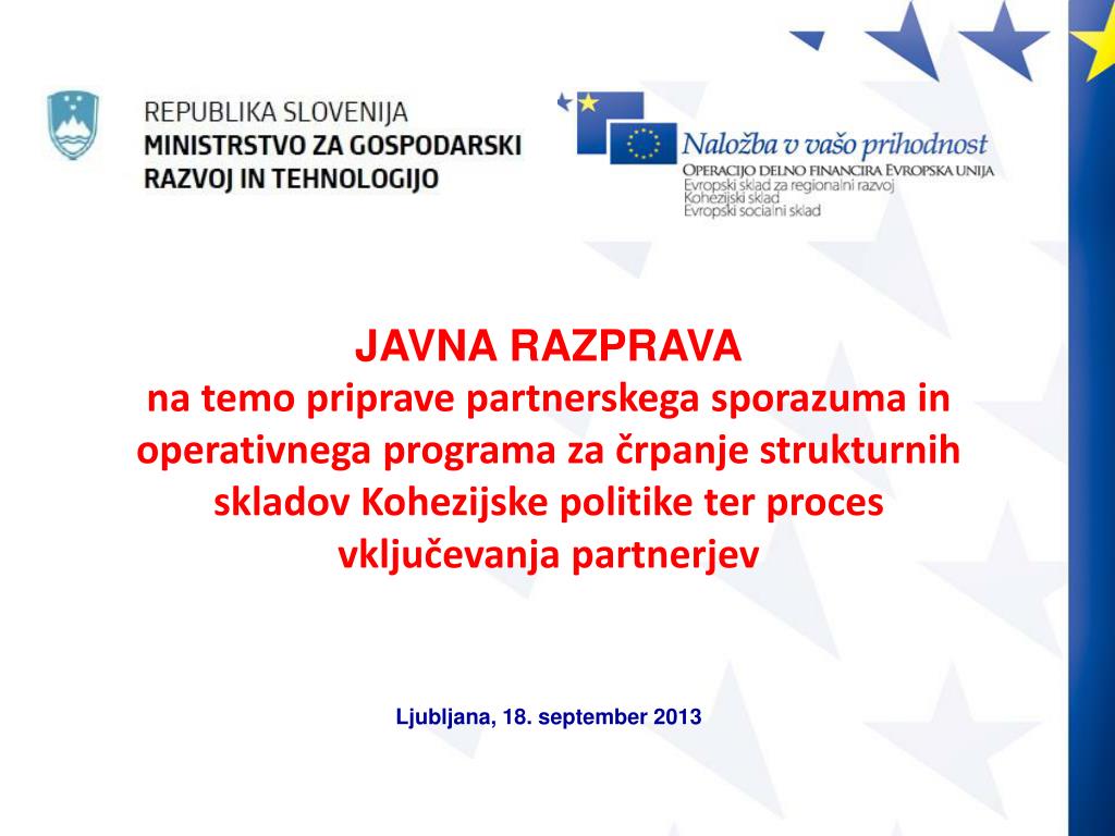 JAVNA RAZPRAVA na temo priprave partnerskega sporazuma in operativnega programa za črpanje strukturnih skladov Kohezijske politike ter proces vključevanja partnerjev Ljubljana, 18. september 2013