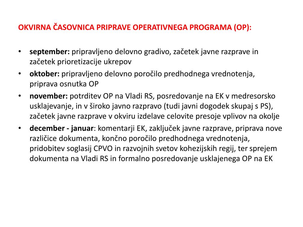 OKVIRNA ČASOVNICA PRIPRAVE OPERATIVNEGA PROGRAMA (OP): • september: pripravljeno delovno gradivo, začetek javne razprave in začetek prioretizacije ukrepov • oktober: pripravljeno delovno poročilo predhodnega vrednotenja, priprava osnutka OP • november: potrditev OP na Vladi RS, posredovanje na EK v medresorsko usklajevanje, in v široko javno razpravo (tudi javni dogodek skupaj s PS), začetek javne razprave v okviru izdelave celovite presoje vplivov na okolje • december - januar: komentarji EK, zaključek javne razprave, priprava nove različice dokumenta, končno poročilo predhodnega vrednotenja, pridobitev soglasij CPVO in razvojnih svetov kohezijskih regij, ter sprejem dokumenta na Vladi RS in formalno posredovanje usklajenega OP na EK