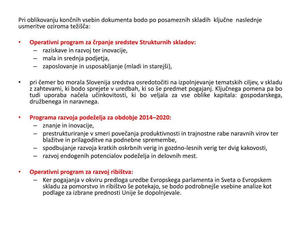 Pri oblikovanju končnih vsebin dokumenta bodo po posameznih skladih ključne naslednje usmeritve oziroma težišča: • Operativni program za črpanje sredstev Strukturnih skladov: • raziskave in razvoj ter inovacije, • mala in srednja podjetja, • zaposlovanje in usposabljanje (mladi in starejši), • pri čemer bo morala Slovenija sredstva osredotočiti na izpolnjevanje tematskih ciljev, v skladu z zahtevami, ki bodo sprejete v uredbah, ki so še predmet pogajanj. Ključnega pomena pa bo tudi uporaba načela učinkovitosti, ki bo veljala za vse oblike kapitala: gospodarskega, družbenega in naravnega. • Programa razvoja podeželja za obdobje 2014–2020: • znanje in inovacije, • prestrukturiranje v smeri povečanja produktivnosti in trajnostne rabe naravnih virov ter blažitve in prilagoditve na podnebne spremembe, • spodbujanje razvoja kratkih oskrbnih verig in gozdno-lesnih verig ter dvig kakovosti, • razvoj endogenih potencialov podeželja in delovnih mest. • Operativni program za razvoj ribištva: • Ker pogajanja v okviru predloga uredbe Evropskega parlamenta in Sveta o Evropskem skladu za pomorstvo in ribištvo še potekajo, se bodo podrobnejše vsebine analize kot podlage za izbrane prednosti Unije še dopolnjevale.