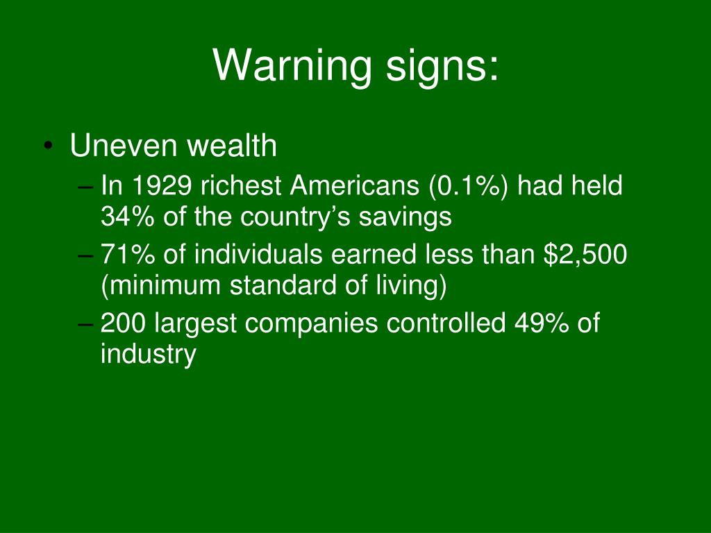 Warning signs: • Uneven wealth • In 1929 richest Americans (0.1%) had held 34% of the country’s savings • 71% of individuals earned less than $2,500 (minimum standard of living) • 200 largest companies controlled 49% of industry