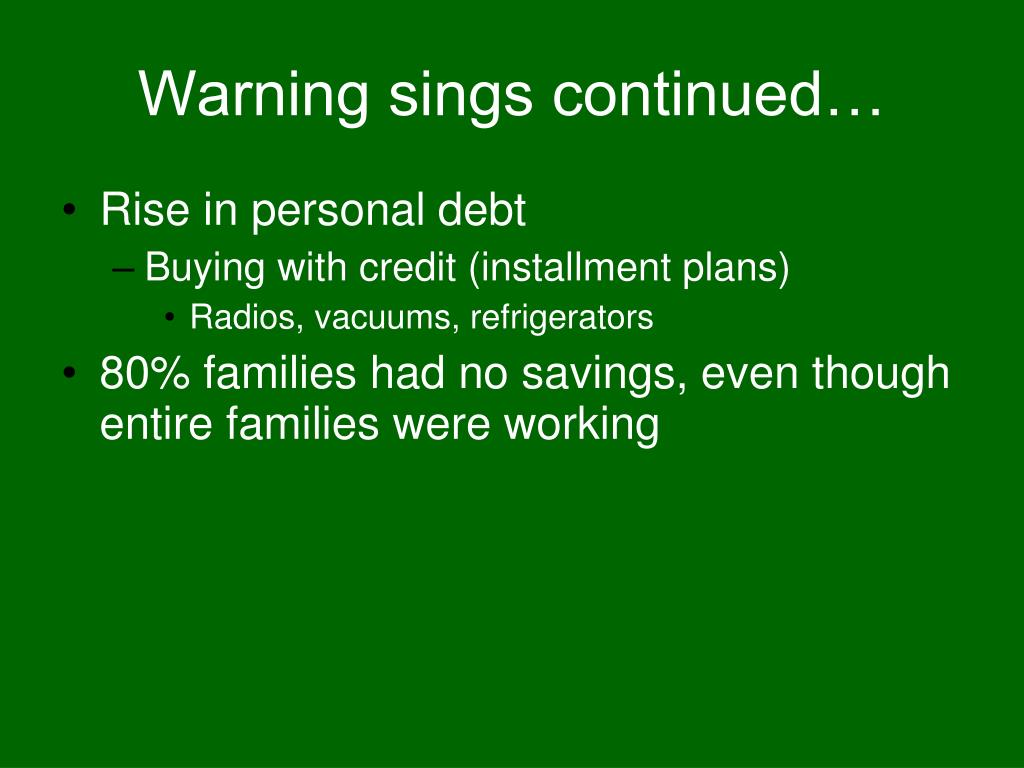 Warning sings continued… • Rise in personal debt • Buying with credit (installment plans) • Radios, vacuums, refrigerators • 80% families had no savings, even though entire families were working