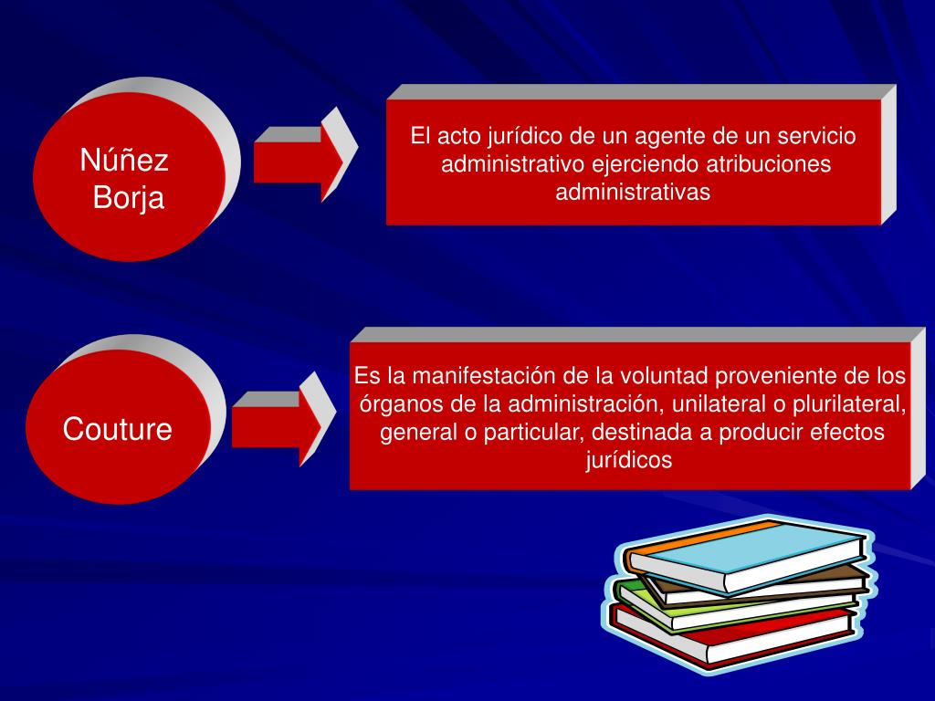 Núñez Borja El acto jurídico de un agente de un servicio administrativo ejerciendo atribuciones administrativas Es la manifestación de la voluntad proveniente de los órganos de la administración, unilateral o plurilateral, general o particular, destinada a producir efectos jurídicos Couture