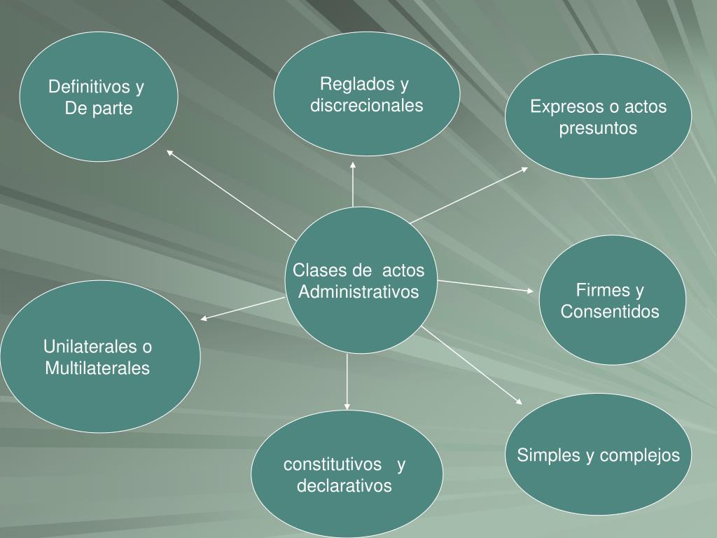 Definitivos y De parte Reglados y discrecionales Expresos o actos presuntos Clases de actos Administrativos Firmes y Consentidos Unilaterales o Multilaterales Simples y complejos constitutivos y declarativos