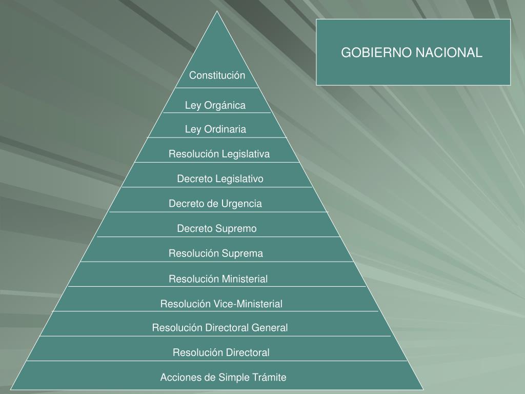 Constitución Ley Orgánica Ley Ordinaria Resolución Legislativa Decreto Legislativo Decreto de Urgencia Decreto Supremo Resolución Suprema Resolución Ministerial Resolución Vice-Ministerial Resolución Directoral General Resolución Directoral Acciones de Simple Trámite GOBIERNO NACIONAL