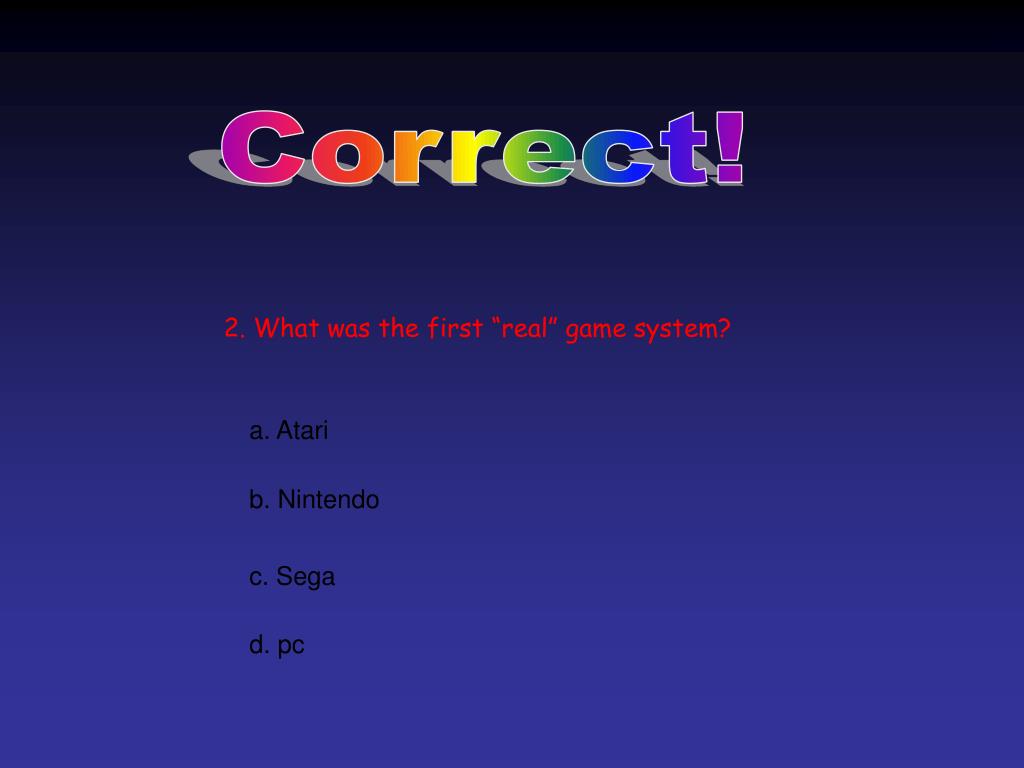 Correct! 2. What was the first “real” game system? a. Atari b. Nintendo c. Sega d. pc
