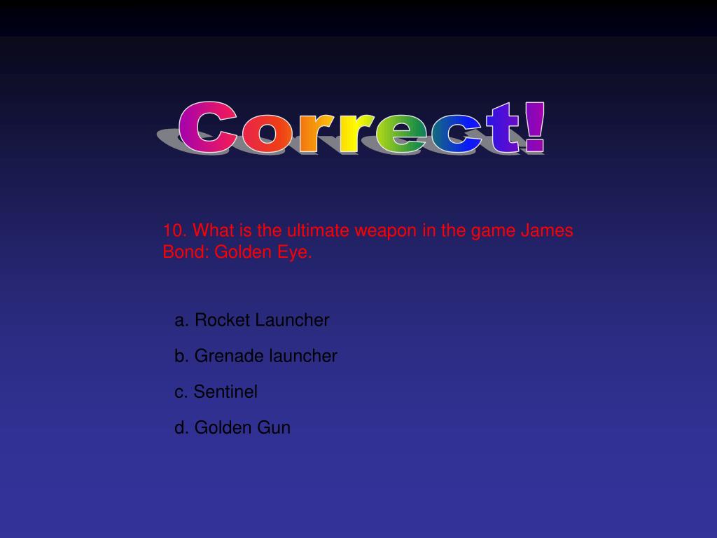 Correct! 10. What is the ultimate weapon in the game James Bond: Golden Eye. a. Rocket Launcher b. Grenade launcher c. Sentinel d. Golden Gun