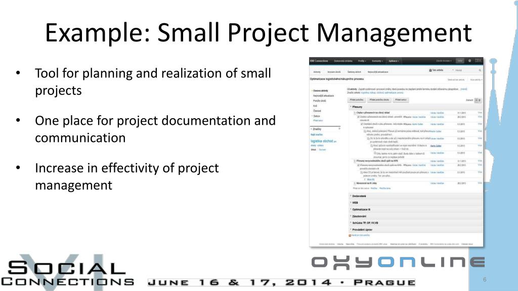 Example: Small Project Management • Toolforplanningandrealizationofsmallprojects • One place for project documentation and communication • Increase in effectivityofproject management