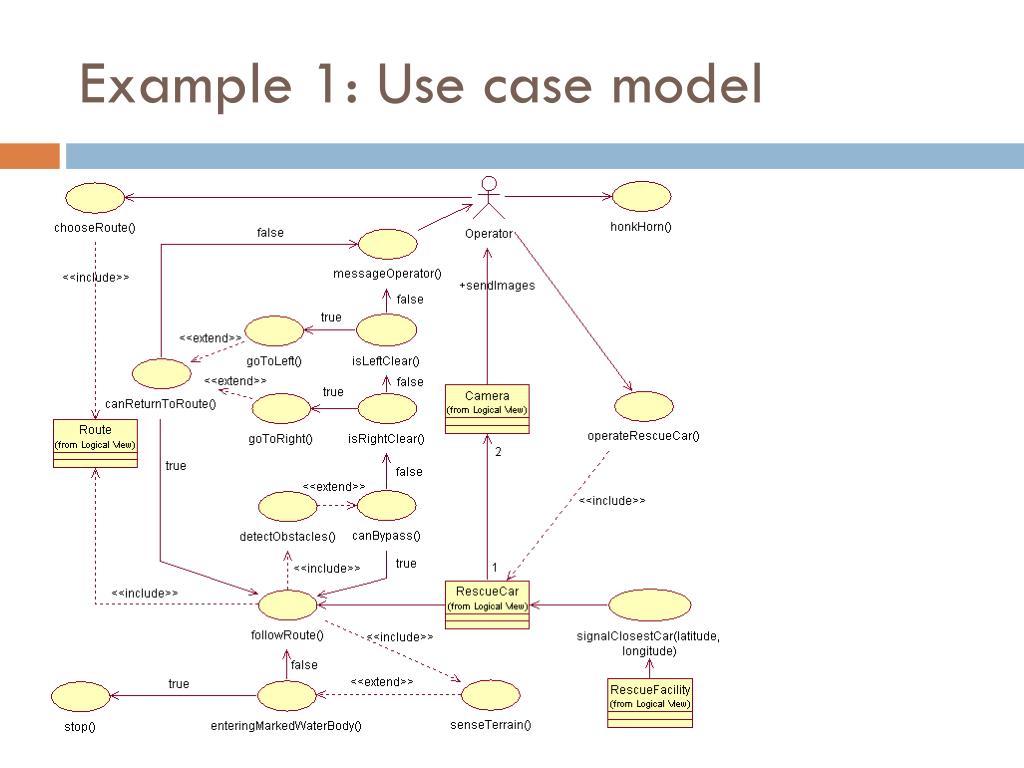 Experiences • Example 1: model a rescue system for the Australian Outback • Victim calls for help • Operator plans route • Self-guided system delivers supplies • System can navigate obstacles • Goal of assignment: check skills retention • Students: capstone project course • Prerequisites: Data Structures, Object-Oriented Analysis & Design, Intermediate Software Engineering