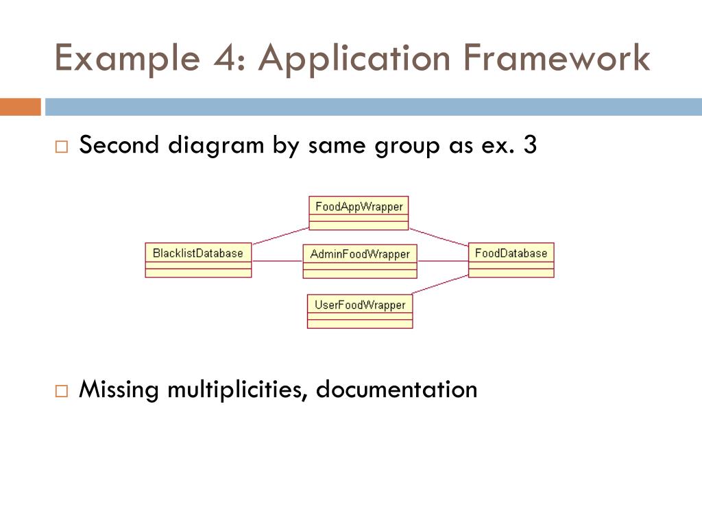 Example 4: Application Framework • Second diagram by same group as ex. 3 • Missing multiplicities, documentation