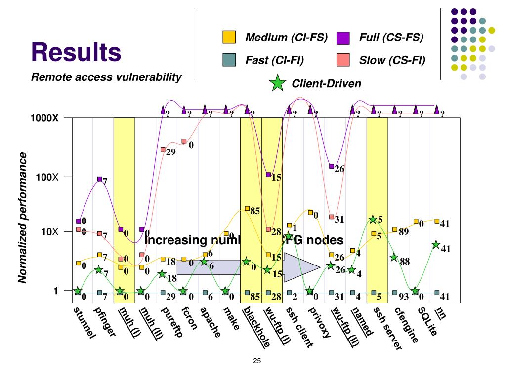 Full (CS-FS) Medium (CI-FS) Slow (CS-FI) Fast (CI-FI) Client-Driven ? ? ? ? ? ? ? ? ? ? ? ? 0 100X 29 26 15 7 85 0 31 5 0 0 41 1 0 28 89 0 0 7 0 5 Increasing number of CFG nodes 1 41 6 4 7 15 26 0 0 1 18 88 0 0 6 0 26 0 0 7 15 4 18 nn fcron make named SQLite muh (I) pfinger pureftp apache stunnel privoxy muh (II) cfengine wu-ftp (I) wu-ftp (II) blackhole ssh client ssh server 0 7 0 0 29 0 6 0 85 28 2 0 31 4 5 93 0 41 Results Remote access vulnerability 1000X Normalized performance 10X