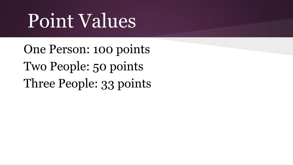 Point Values One Person: 100 points Two People: 50 points Three People: 33 points